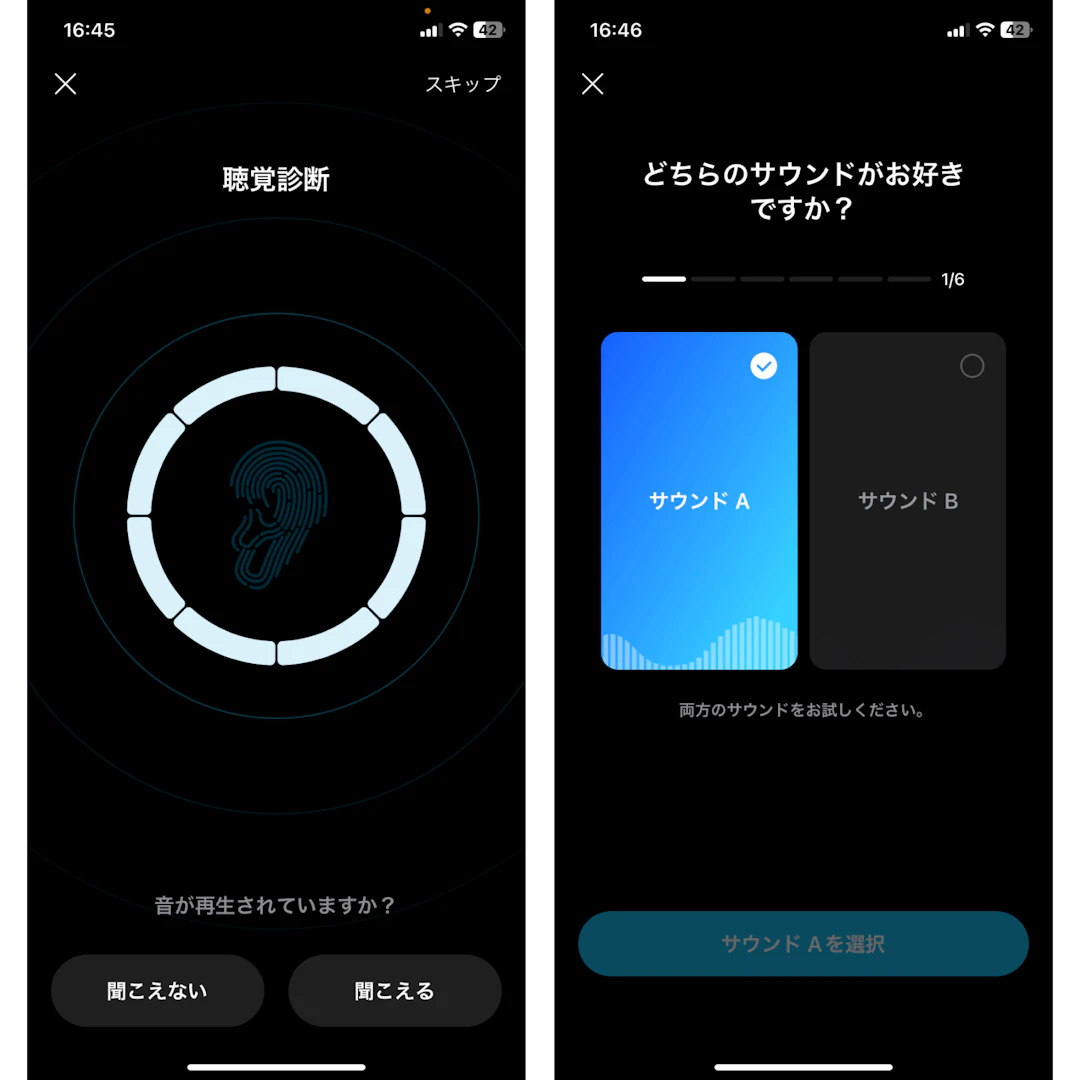 健康診断でよくあるような聴覚検査のようなものから、実際にサンプルの音楽を複数種類再生した上でどれが聴きやすいかを選択してようなものです。診断は約3分ほどで完了でき、パーソナライズされたイヤホンに設定していくことができます。
