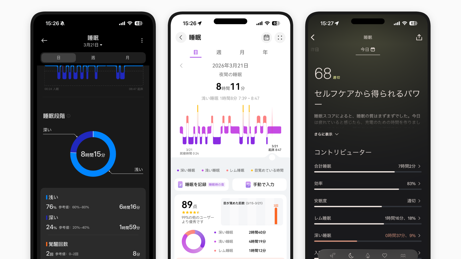 Oura Ring 4が最も短く、Xiaomiバンドはそこから約1時間長く、Huaweiバンドはさらに約1時間長い。合計で約2時間の差です。